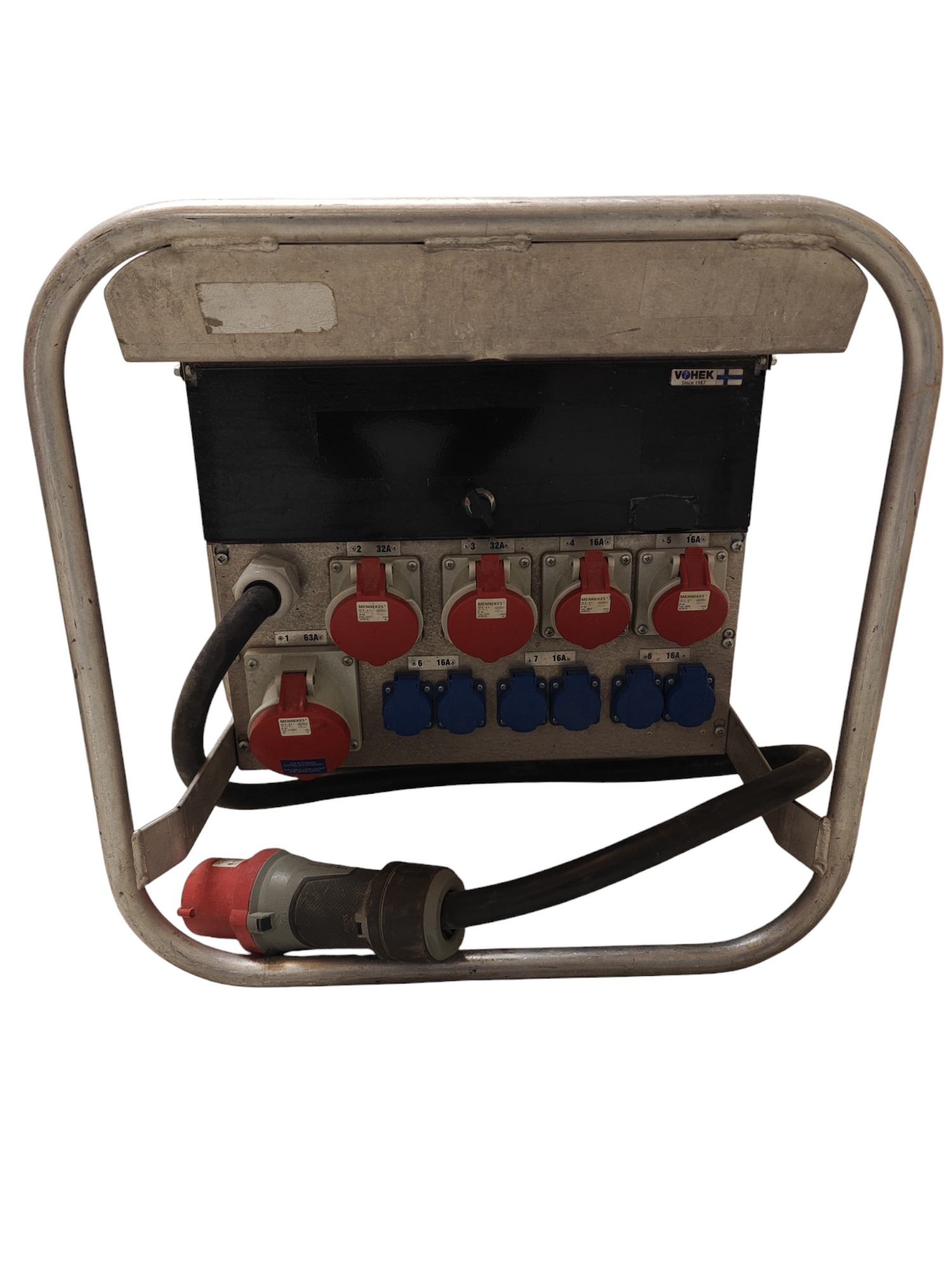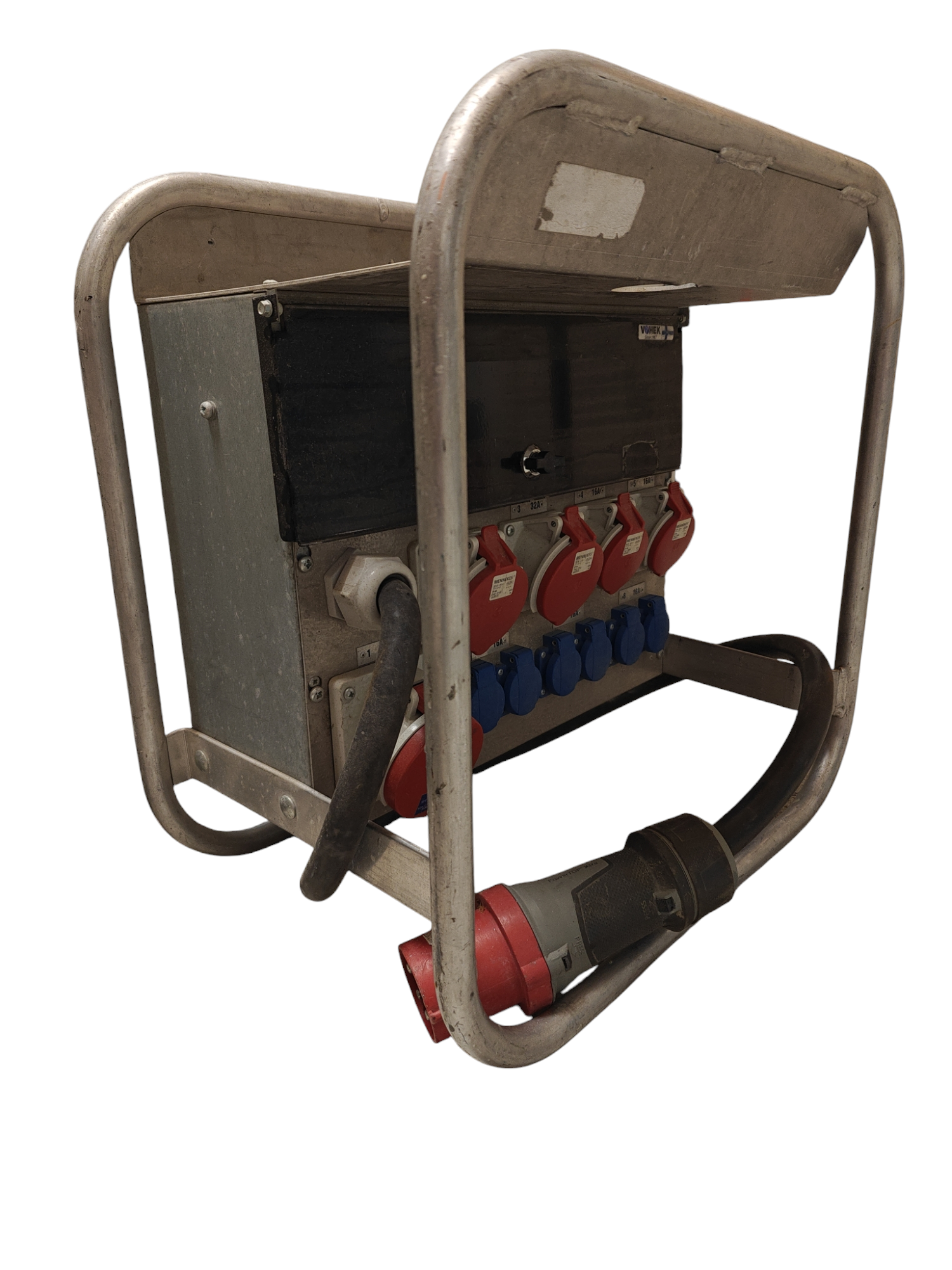 63A nimellisteholla varustettu alakeskus metallikehikolla. Alakeskuksen sähköverkkoon liittäminen onnistuu noin 2 metrin pituisella johdolla ja 63A tulpalla. Siinä on 11 pistorasialähtöä, joista kuusi on suko 230V 16A. Loput viisi ovat 2x16A, 2x32A ja 1x63A. Alakeskuksessa on neljä 30mA vikavirtasuojaa pistorasioissa.